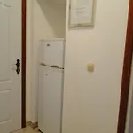 Et tekøkken er udstyret med et køleskab og køkkenudstyr.